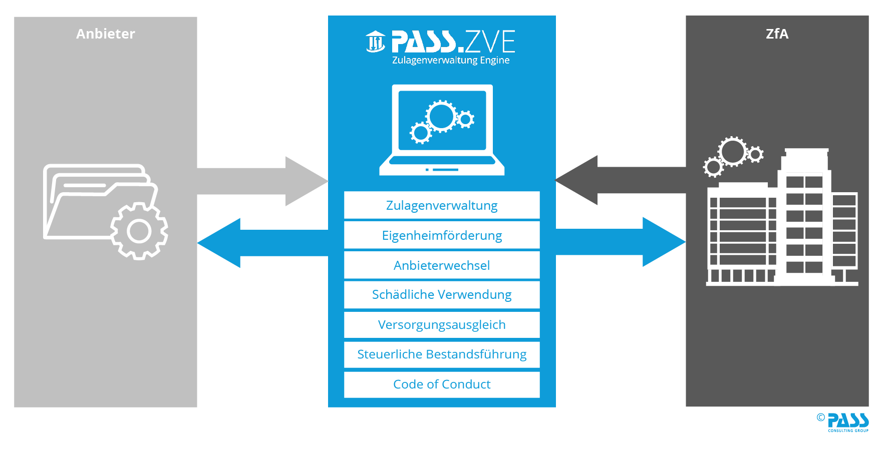 Aus der PASS Riester Engine Zulagenverwaltung (REZ) wird unsere neue PASS Zulagenverwaltungsengine (PASS.ZVE). Die PASS.ZVE regelt alle Prozesse zwischen der Zentralen Zulagenstelle für Altersvermögen (ZfA) und dem Anbieter bisheriger Riesterverträge sowie der ab 2027 neuen Marktprodukte der steuerlich geförderten privaten Altersvorsorge (Altersvorsorgedepot, Standarddepot und Garantieprodukte). Sie ist ein Standardsystem zur Zulagenverwaltung von steuerlich geförderten Altersvorsorgeprodukten. Die PASS.ZVE wird als produktneutrale Verwaltungssoftware zwischen die Systeme des Anbieters von geförderten Altersvorsorgeprodukten (Bank, Versicherung, Bausparkasse, etc.) und der ZfA geschaltet. Mit der PASS.ZVE werden alle vorgegebenen Geschäftsvorfälle (z.B. Kapitalübertragung und schädliche Verwendung) des Regulators unterstützt. Sie verfügt über alle notwendigen Meldungstypen von und zur ZfA. Mit dem vorhandenen Bestandsführungssystem des Finanzdienstleisters wird die Applikation auf Basis standardisierter Adapter individuell eingerichtet. Zusätzlich zur ZVE bietet PASS eine umfassende Beratung zu den fachlichen und technischen Prozessen rund um die Zulagenverwaltung an. Bei den Betriebsmodellen haben Sie die Wahl aus der gesamten Bandbreite: vom Lizenzerwerb (On-Premises) über SaaS (Software-as-a-Service) bis hin zu BPO (Business Process Outsourcing) und ganz individuellen Modellen ist alles möglich. Möchten Sie die Zulagenverwaltung komplett auslagern, dann übernimmt das Competence Center der PASS Vorsorge Solutions in einem „Rundum-Sorglos-Paket“ alle Servicedienstleistungen.