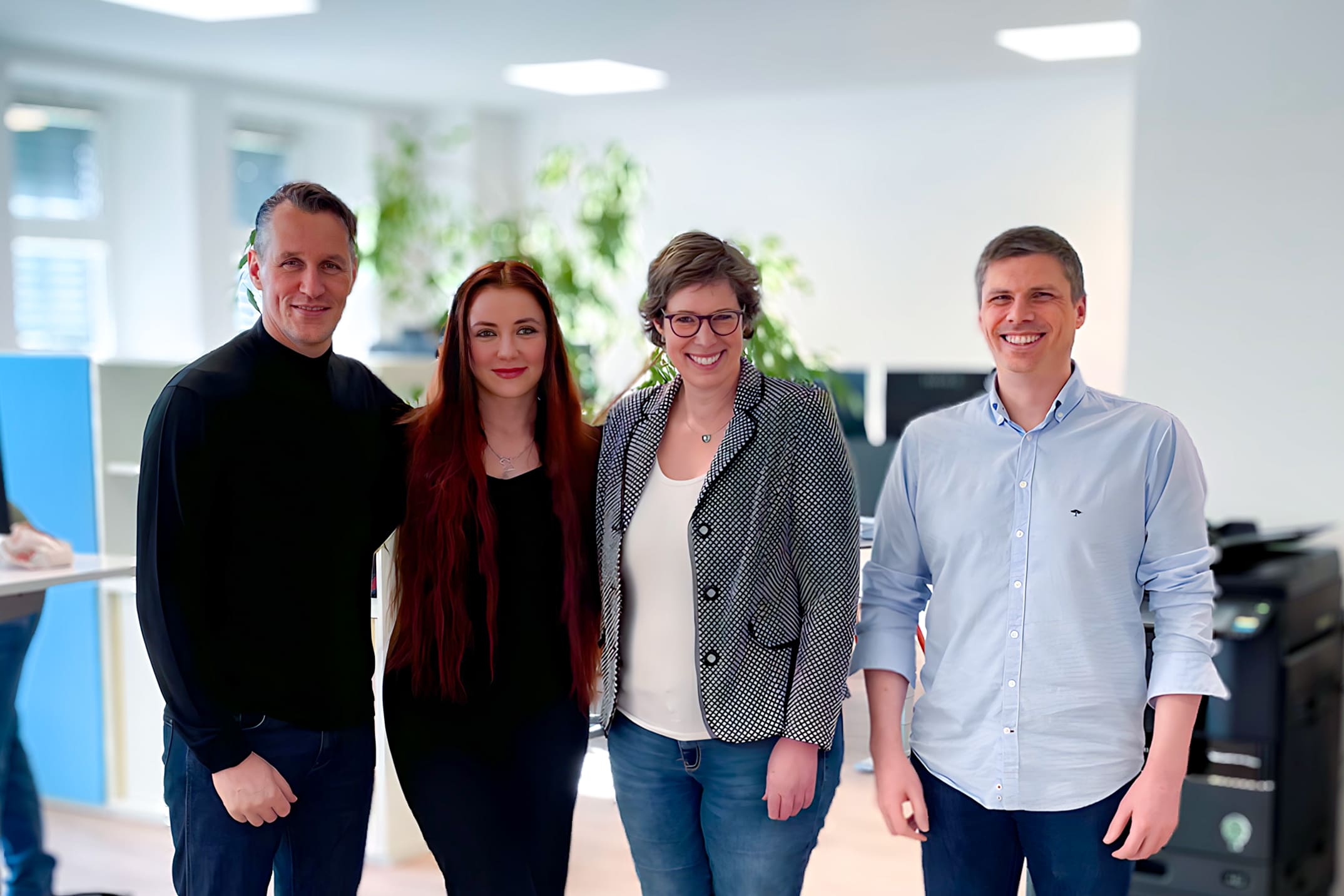 Die Geschäftsführung der PASS Multibank Solutions in den neuen Geschäftsräumen am Mönkedamm: (von links) Vorstand Werner Traidl, Dr. Olga Olashyn, Andrea Swennosen und Marco Erb.